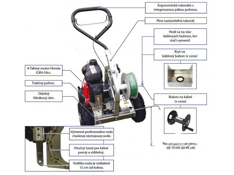 Nyní s vylepšeními, jako např. uzpůsobení na pokládání kabelu do síly 6 mm, v ceně nyní nový nůž Heavy Duty Carbid a počítadlo motohodin.