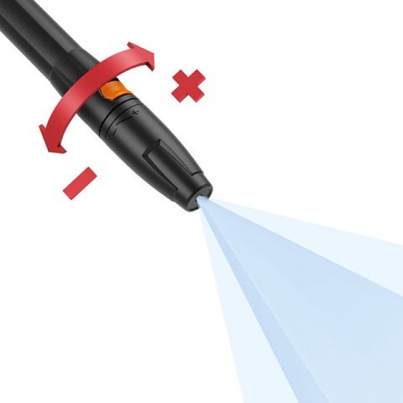 Díky otočné stříkací trubce je možné vysokotlaký paprsek jednotlivým pracovním situacím.Rychloupínací systém usnadňuje a zrychluje propojení mezi vysokotlakou hadicí a pistolí. Tento systém rovněž odstraňuje možnost zkroucení tlakové hadice.Pro aplikaci čistícího prostředku jsou všechny tlakové čističe sériově vybaveny aplikační sadou.