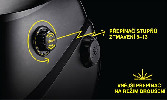 Stejně jako Sentinel má i kukla Savage A40 pro větší pohodlí zvenku zabudovaný přepínač na režim broušení či zapnutí ztmavení DIN 9–13, díky němuž můžete režimy snadno měnit i v silných rukavicích.